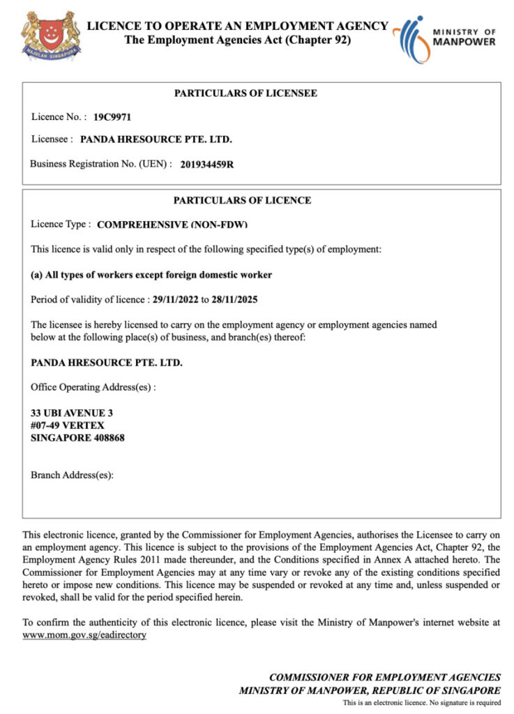 Panda HResource Pte Ltd—licensed by MOM (19C9971), providing trusted manpower solutions across industries in Singapore.